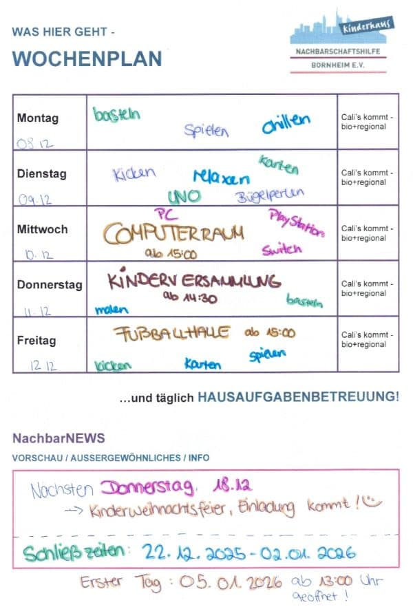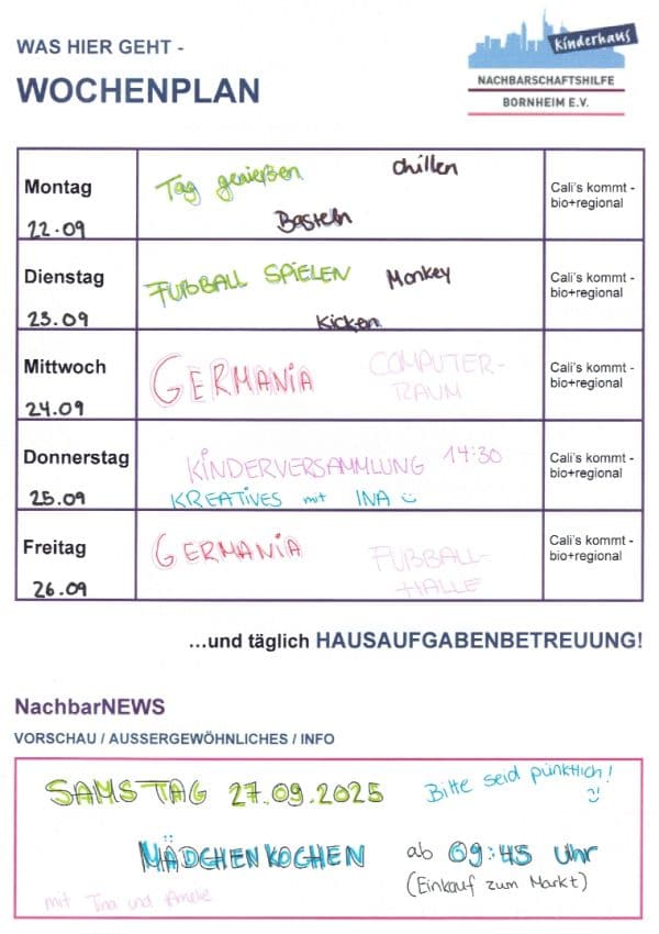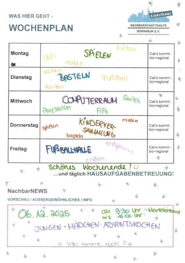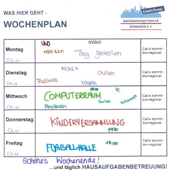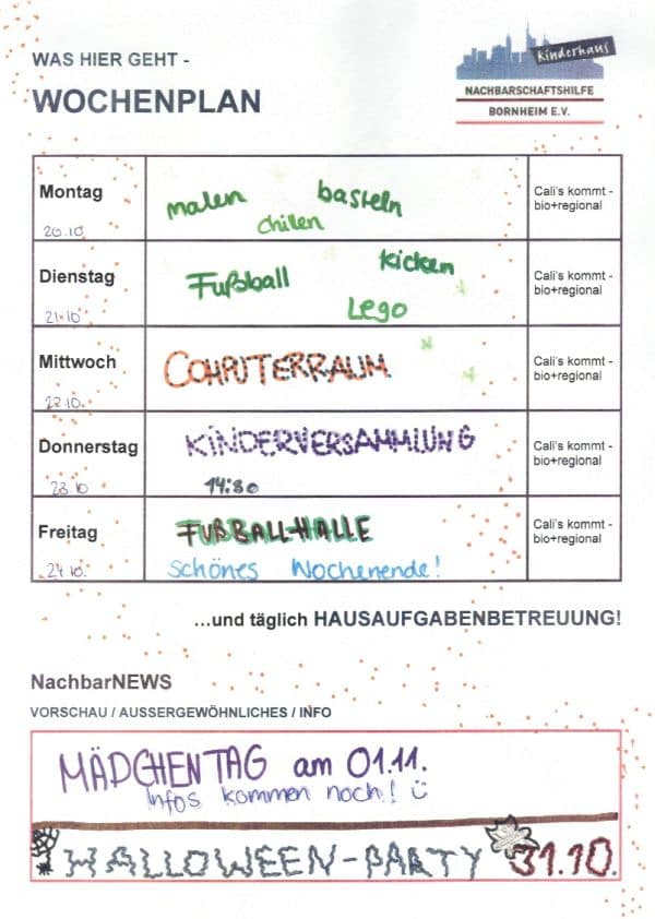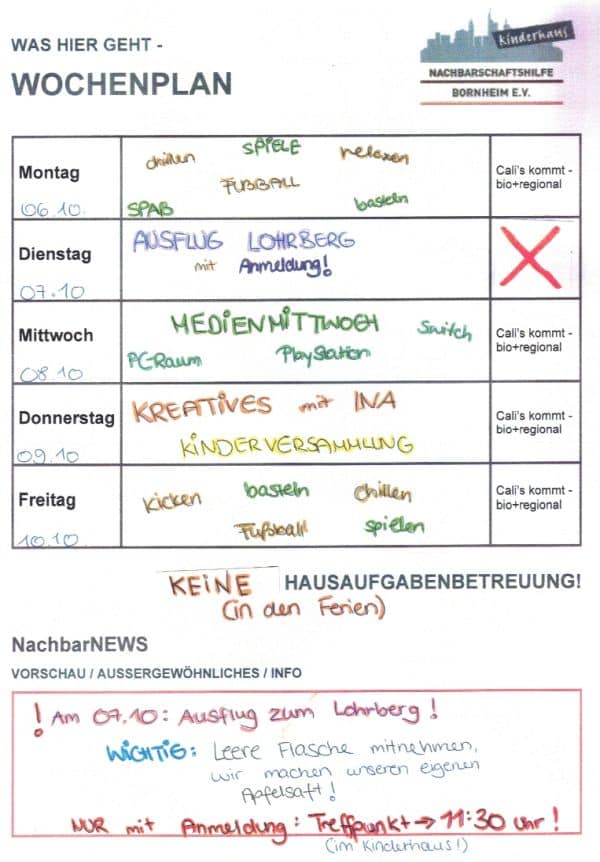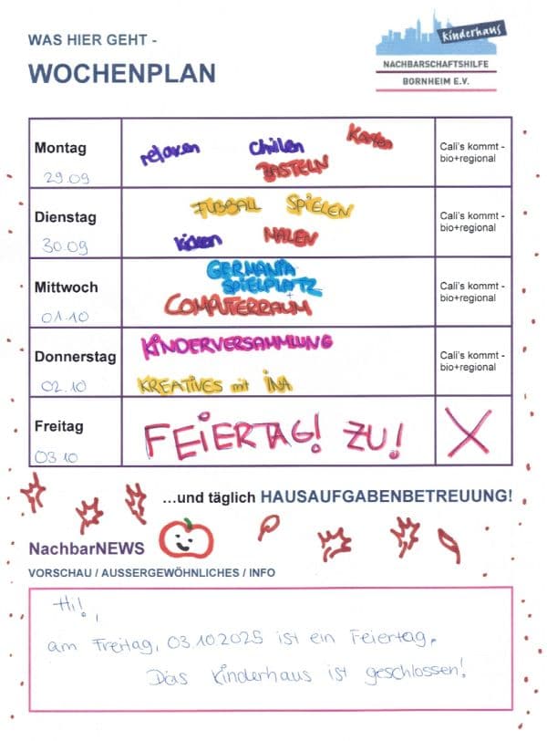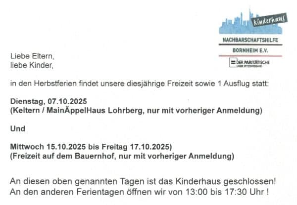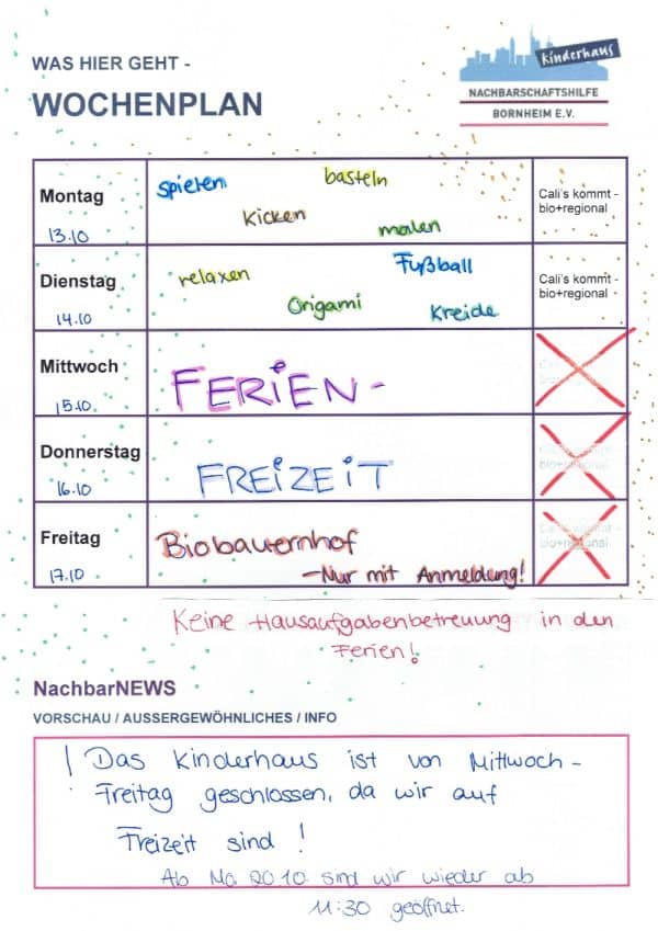 Vom 15.10. bis zum 17.10. ist das Kinderhaus wegen der Freizeit geschlossen. |