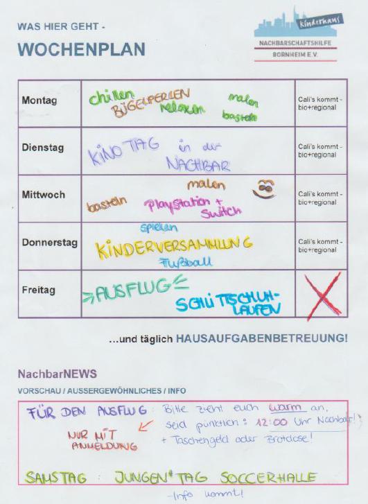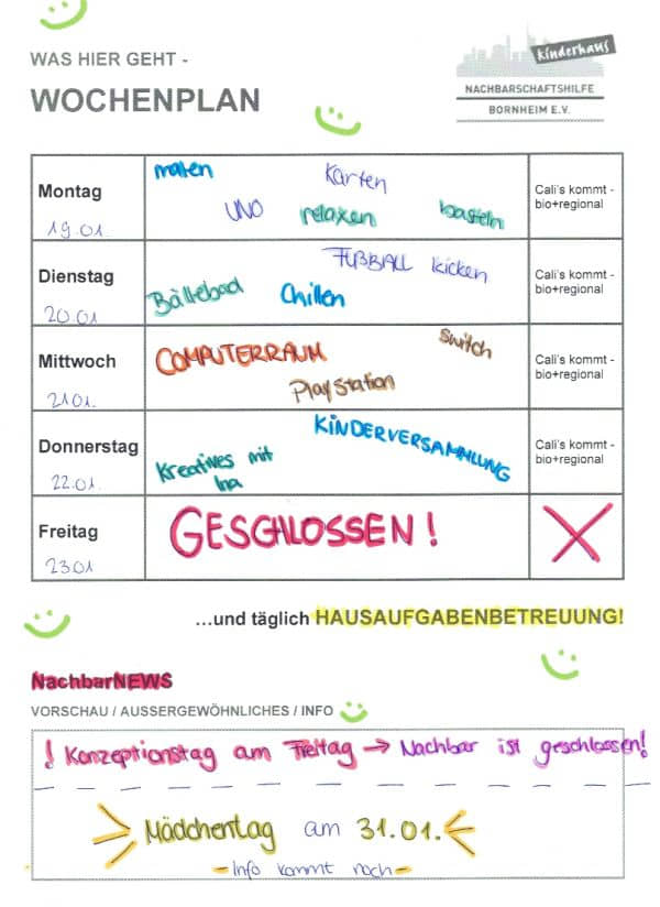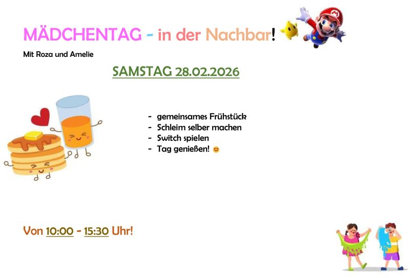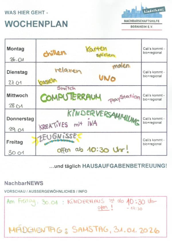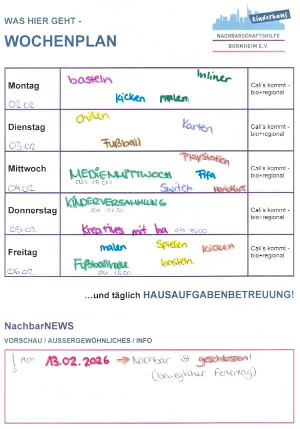 Vom 20.12.2025 bis 4.1.2026 bleibt die "Nachbar" geschlossen. Ab dem 5.1. haben wir wieder für euch Montag bis Freitag von 13.00 bis 17:30 geöffnet! |